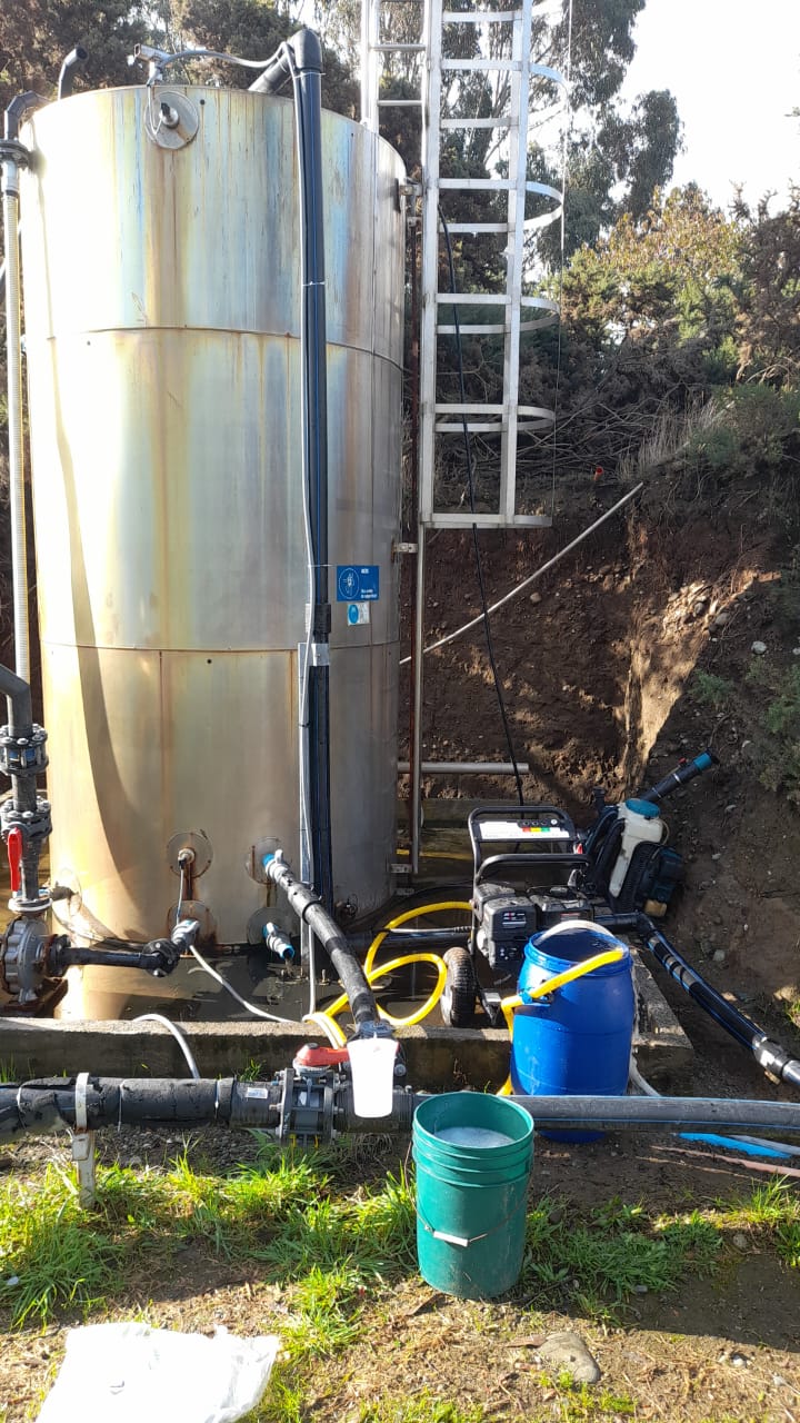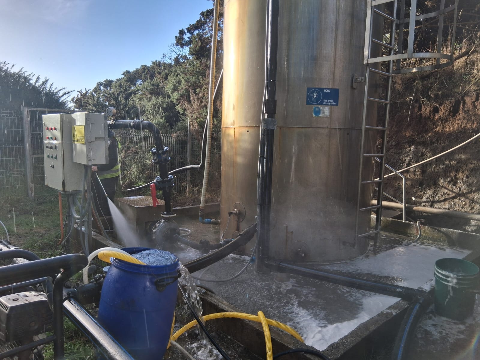 En mayo de 2025, Soluciones Chiloé realizó la limpieza de un estanque de inox en instalaciones de AquaChile. El trabajo consistió en la limpieza exhaustiva del interior y del petril del estanque, seguida de su sanitización completa. Se utilizaron hidro lavadoras de combustión interna, escobillones industriales, fumigadora industrial, detergente alcalino y desinfectante soluble al 15%, además de los EPP correspondientes. La intervención permitió remover residuos orgánicos, aplicar desinfectantes y garantizar condiciones sanitarias óptimas. El trabajo fue ejecutado exitosamente cumpliendo los protocolos de higiene y seguridad, sin incidentes reportados. Se recomienda mantener un calendario regular de limpieza y desinfección.