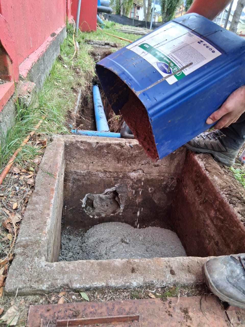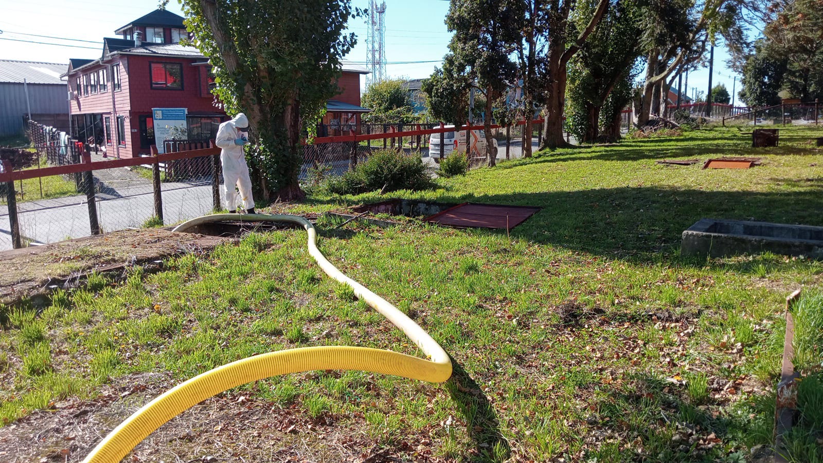 Entre el 5 y el 9 de abril de 2025, Soluciones Chiloé realizó una intervención en dependencias de Salmones de Chile. El servicio consistió en: Canalización de líneas de alcantarillado en el patio de operaciones con tuberías sanitarias de PVC de 110 mm. Construcción de banquetas de hormigón para cumplir con la normativa vigente. Pintura de cámaras de inspección en color amarillo y enumeración de estas para facilitar su identificación. Limpieza de estanques con acumulación de aguas residuales antiguas, con extracción de desechos mediante camión limpia fosas. El trabajo se ejecutó exitosamente, sin complicaciones y cumpliendo con las normativas ambientales vigentes. Se adjuntaron registros fotográficos como respaldo de las labores realizadas.