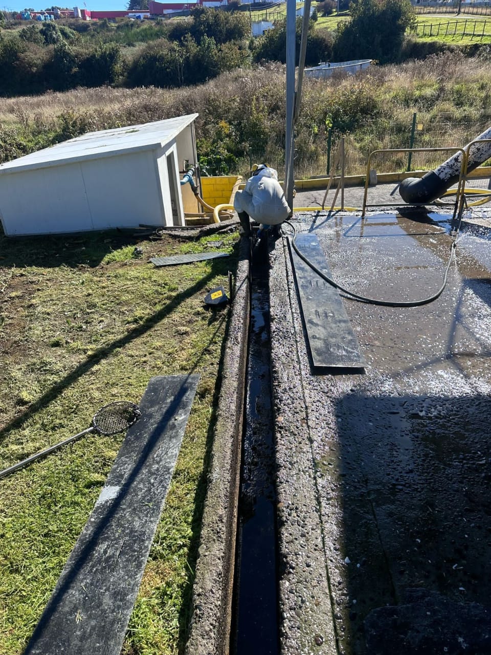 El 5 de abril de 2025, Soluciones Chiloé realizó un servicio de limpieza en instalaciones de Salmones de Chile, específicamente en la planta de matanza y en las cámaras de bombeo. Las labores incluyeron: En la planta de matanza: limpieza profunda de superficies y desagües para eliminar residuos orgánicos acumulados. En las cámaras de bombeo: extracción de lodos y limpieza de paredes internas mediante agua a presión y escobillones industriales, asegurando un correcto flujo de aguas. Se utilizaron camión limpia fosas, sistema de agua a presión, escobillones industriales y elementos de protección personal. El trabajo se ejecutó sin inconvenientes, cumpliendo protocolos de seguridad. No se detectaron obstrucciones mayores y se recomienda realizar este tipo de mantenimiento periódicamente para prevenir acumulaciones excesivas.